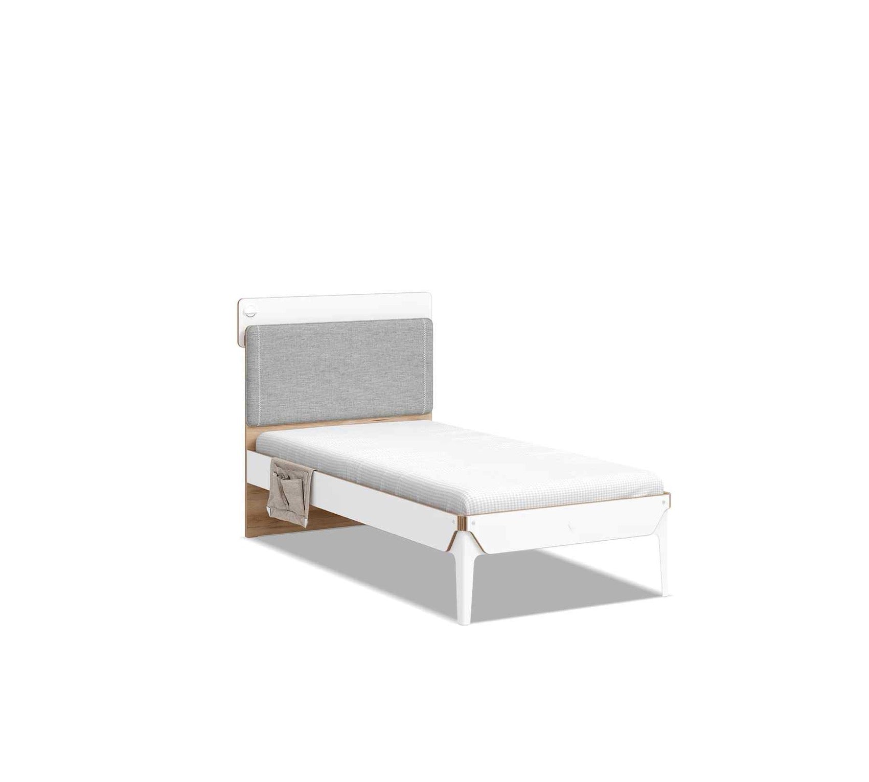 Študentská posteľ L MODERA LINE s rozmerom matraca 100x200 cm vnáša do izby štýlový a súčasný charakter vďaka elegantnému čalúnenému čelu s dekoratívnym prešívaním. Praktický odkladací priestor na zadnej strane čela predstavuje nielen dizajnový prvok, ale aj funkčný úložný priestor. Súčasťou postele je integrovaná nabíjacia jednotka, ktorá umožňuje pohodlné nabíjanie inteligentných zariadení priamo pri lôžku. Textilné vrecko, ktoré je súčasťou vybavenia, pomáha prehľadne usporiadať osobné veci, ako sú tablet, kniha či okuliare.