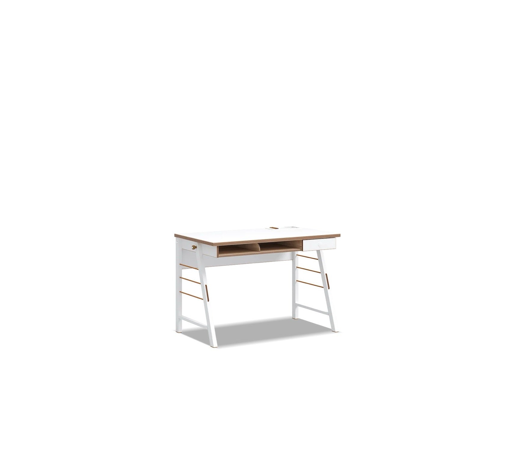 Moderný písací stôl Modera je ideálnym riešením na vytvorenie štýlového a funkčného pracovného priestoru v detských a študentských izbách. Vďaka elegantným líniám a premysleným detailom prináša do interiéru nielen nadčasový dizajn, ale aj vysokú praktickosť. Stôl je vybavený zásuvkou so samozatváracím systémom, ktorá sa otvára a zatvára ticho a plynulo. S nosnosťou až 30 kg poskytuje výbornú stabilitu a dlhú životnosť. Spodná časť pracovnej dosky disponuje dvojdielnou otvorenou policou, ktorá umožňuje jednoduchý prístup k knihám, zošitom či diárom. Kovové nohy dodávajú stolu moderný vzhľad a zároveň zaručujú mimoriadnu pevnosť. Praktický háčik umiestnený na konštrukcii stola slúži na pohodlné zavesenie tašky alebo slúchadiel, čo pomáha udržiavať poriadok.