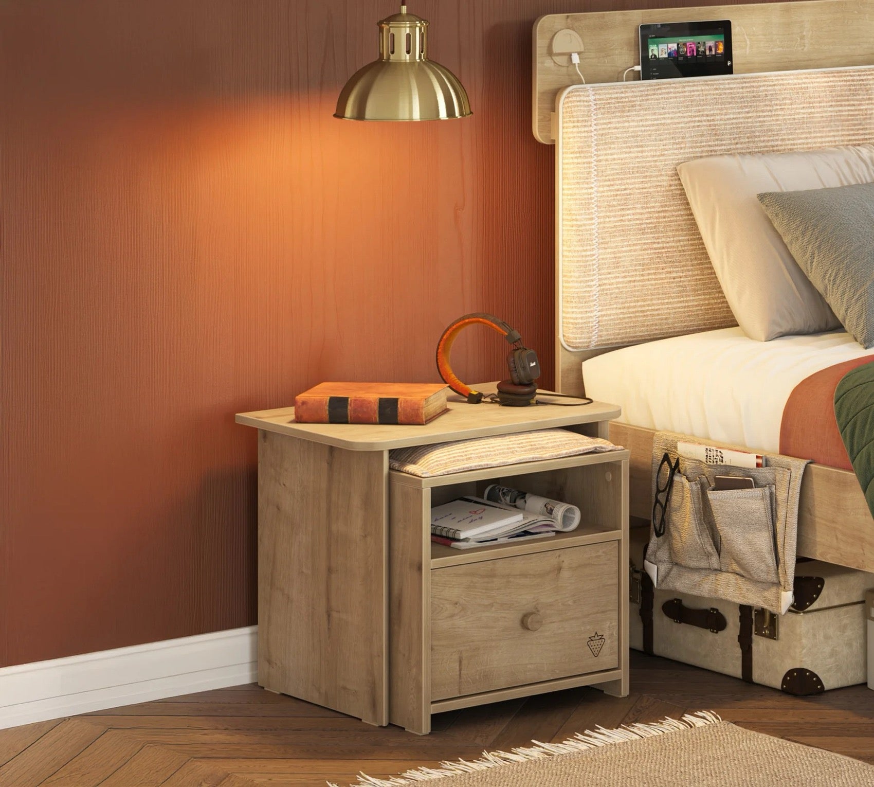 Študentský nočný stolík s taburetom MOCHA predstavuje ideálne riešenie do moderných detských a študentských izieb, v ktorých je dôležitá nielen estetika, ale aj praktické využitie priestoru. Tento multifunkčný kúsok nábytku sa skladá z dvoch samostatných častí, vďaka čomu ponúka flexibilné možnosti umiestnenia aj v menších miestnostiach. Nočný stolík je vybavený priestrannou zásuvkou, ktorá poskytuje dostatok úložného miesta na drobnosti a osobné veci, čím pomáha udržiavať poriadok a prehľad. Súčasťou zostavy je aj pohodlný čalúnený podsedák, ktorý zvyšuje komfort a dodáva celku moderný a útulný vzhľad.