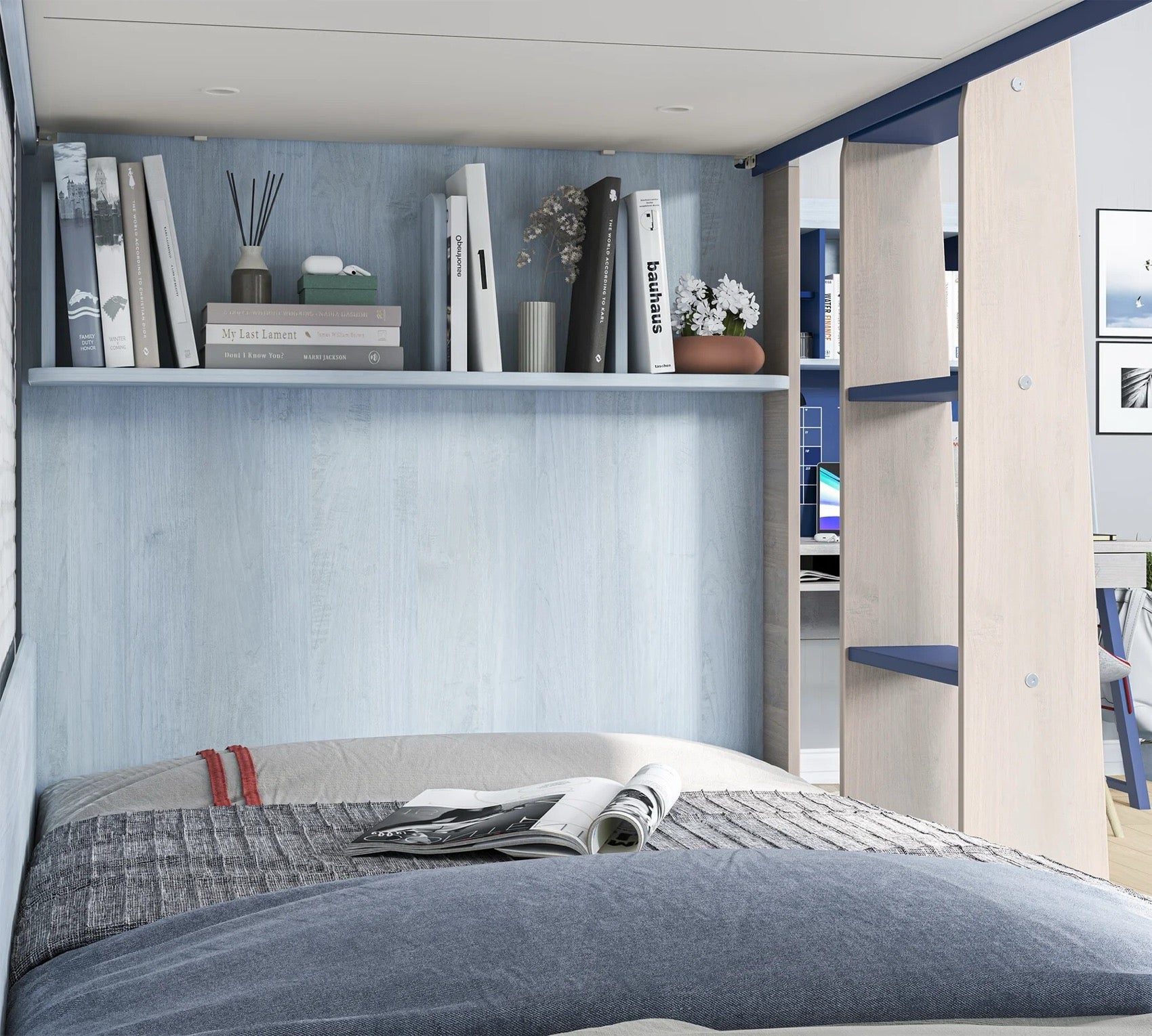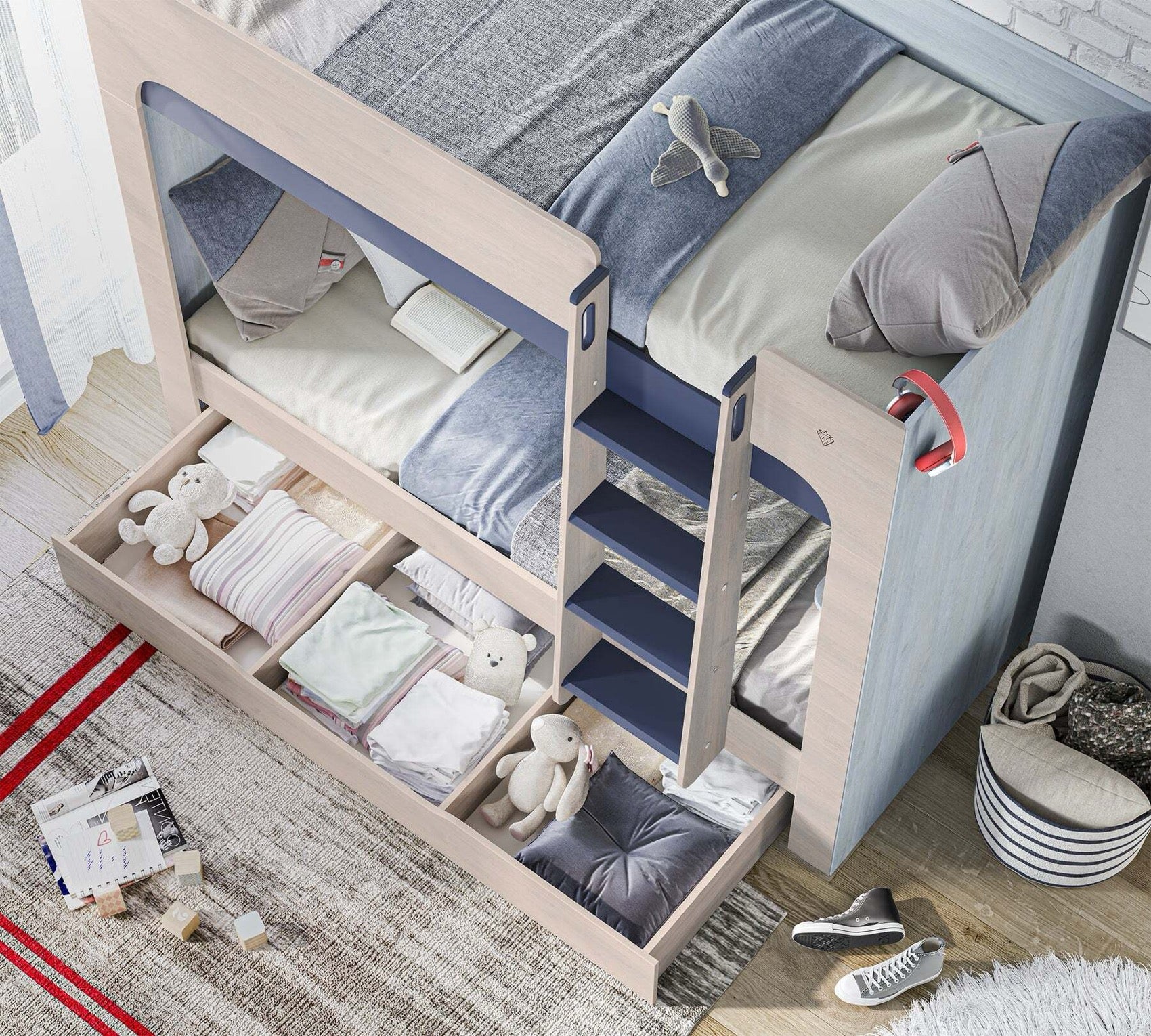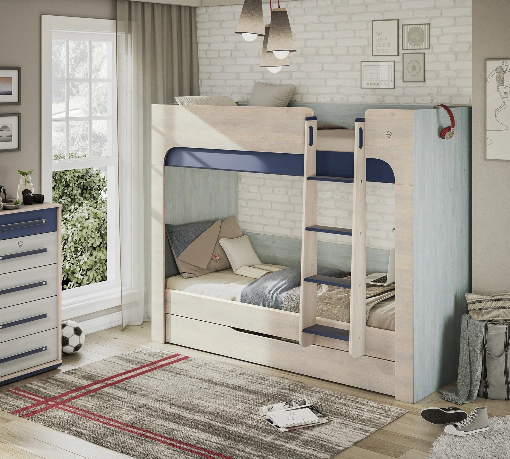 Študentská poschodová posteľ TRIO je ideálnym riešením pre menšie interiéry, kde je potrebné efektívne využiť priestor. Posteľ je navrhnutá tak, aby poskytovala bezpečie a pohodlie pre vaše deti. V cene postele sú zahrnuté kvalitné perforované doskové rošty, ktoré sú umiestnené na spevnenom kovovom ráme, čo zabezpečuje stabilitu a dlhú životnosť produktu. Pre dodatočné úložné riešenie môžete doplniť posteľ výsuvom pod posteľ (20.40.1403.00), ktorý nie je zahrnutý v cene. Každé lôžko má nosnosť až 130 kg, čo zaručuje, že posteľ bude schopná uniesť aj väčšie deti. Posteľ je vybavená praktickou policou, ktorá poskytuje dodatkovej úložný priestor pre hračky alebo knihy.