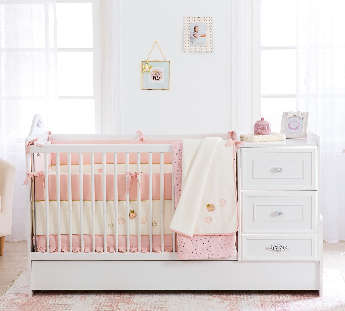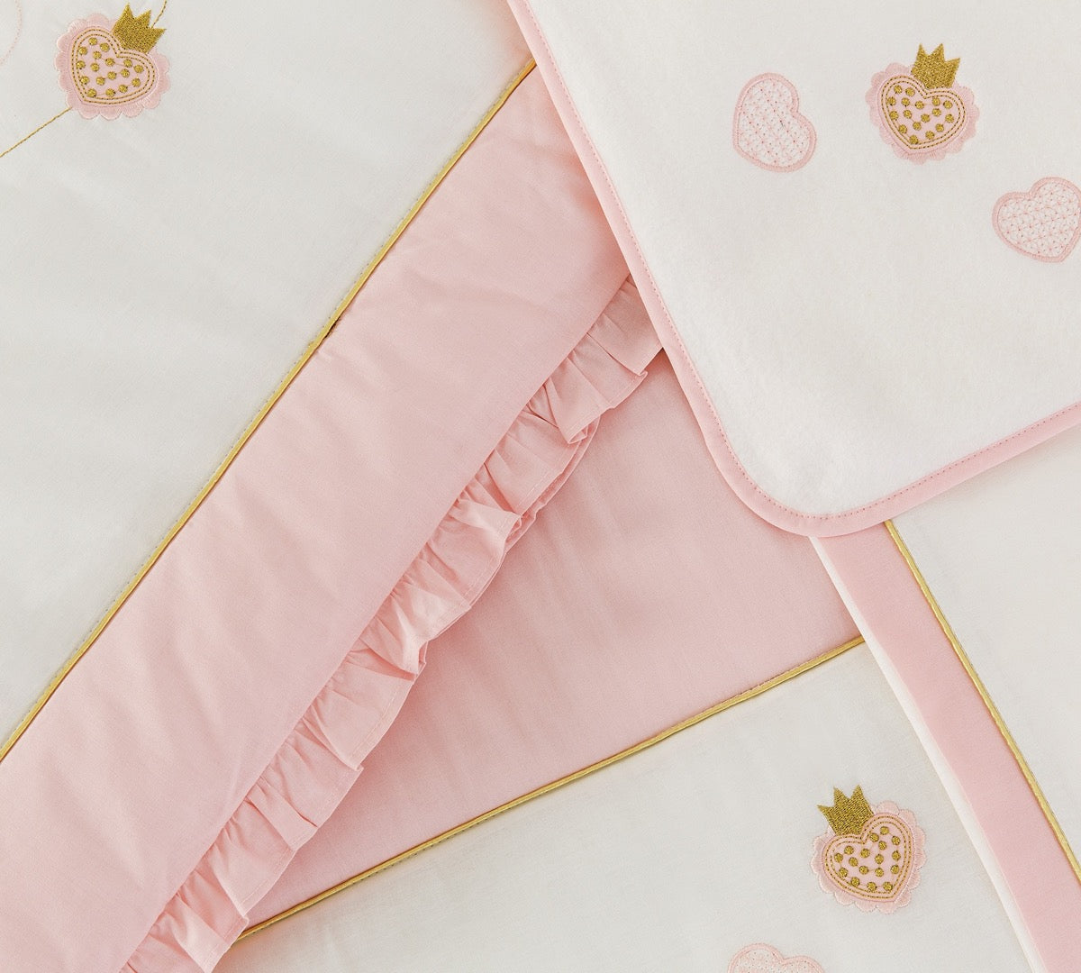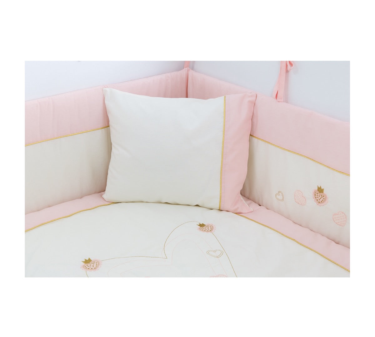 Detský postieľkový set QUEEN je skvelou voľbou pre detské rastúce postieľky. Set zaručuje pohodlný spánok pre Vaše deti vďaka jeho kvalitnej bavlnenej štruktúre. S dekoratívnym výšivkami srdca prináša do intériéru rozmantický nádych. Navyše je veľmi funkčný a praktický. Ochranné mantinely sa k postieľke priväzujú pomocou šnúrok. Držia pevne na svojom mieste, vďaka čomu dieťatku zabezpečujú ochranu proti úderu. Postieľkový set je možné prať na 30 stupňov a žehliť pri nízkej teplote. Materiál je 100% bavlna, výplň je 100% polyester.
