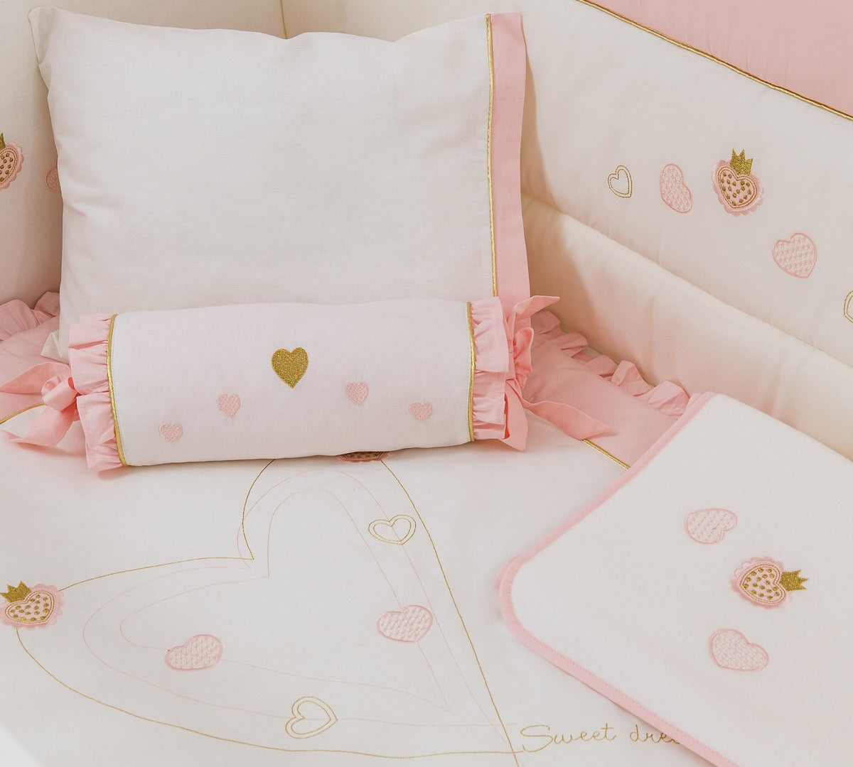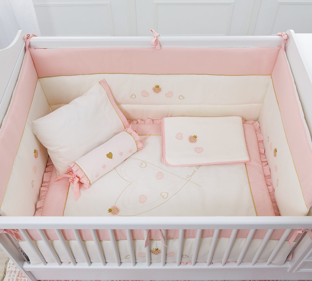 Detský postieľkový set QUEEN je skvelou voľbou pre detské rastúce postieľky. Set zaručuje pohodlný spánok pre Vaše deti vďaka jeho kvalitnej bavlnenej štruktúre. S dekoratívnym výšivkami srdca prináša do intériéru rozmantický nádych. Navyše je veľmi funkčný a praktický. Ochranné mantinely sa k postieľke priväzujú pomocou šnúrok. Držia pevne na svojom mieste, vďaka čomu dieťatku zabezpečujú ochranu proti úderu. Postieľkový set je možné prať na 30 stupňov a žehliť pri nízkej teplote. Materiál je 100% bavlna, výplň je 100% polyester.
