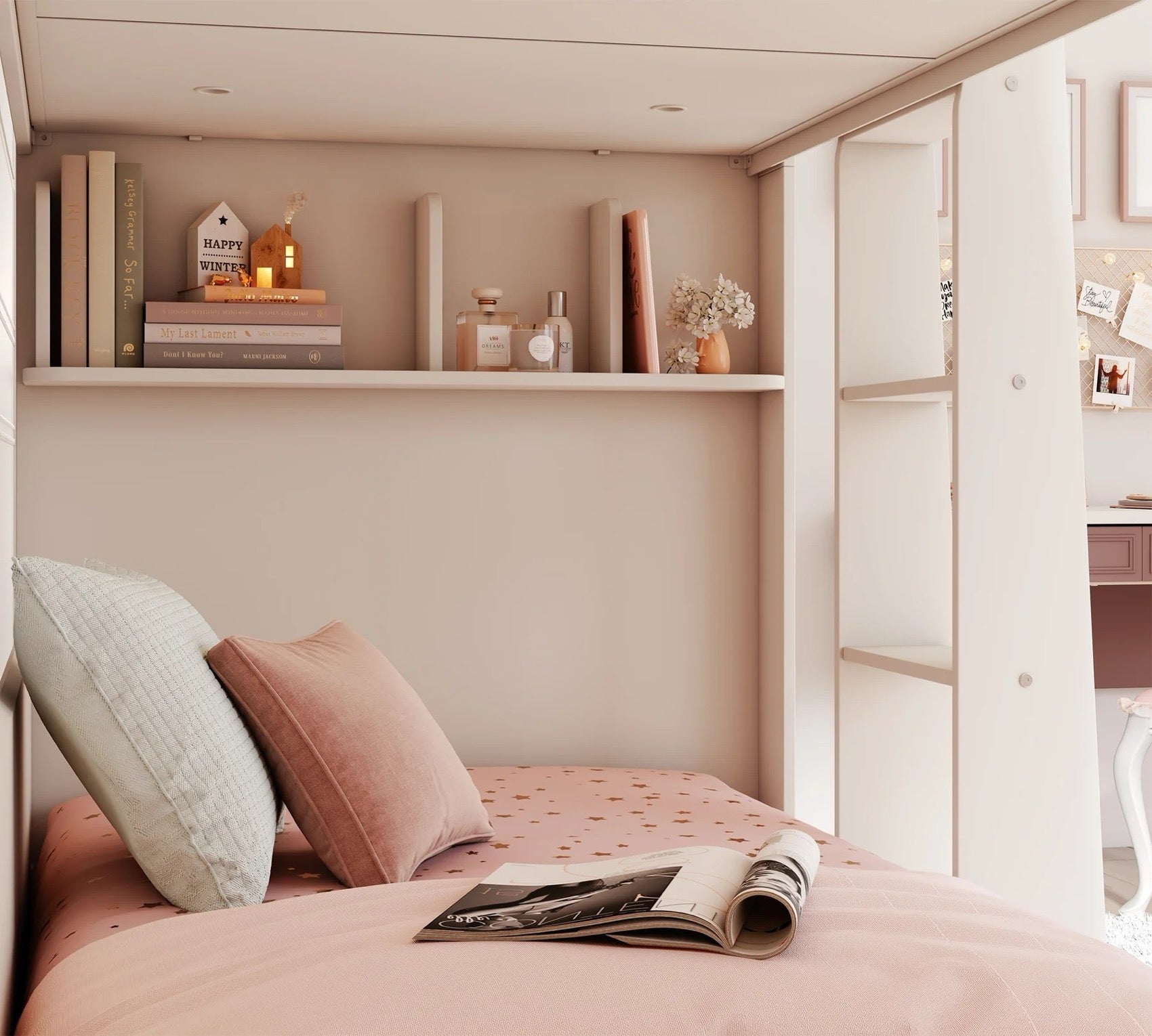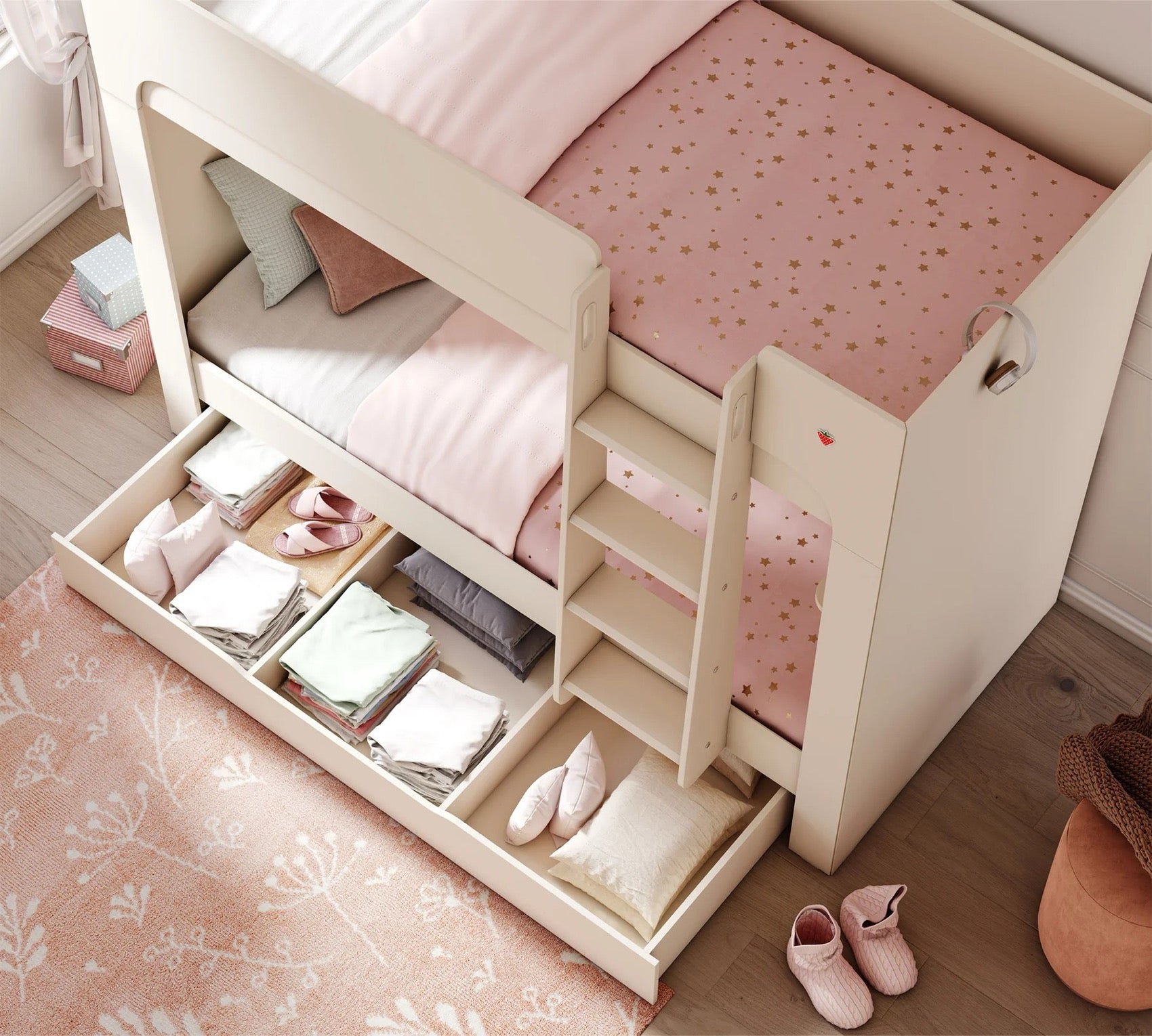 Detská poschodová posteľ VARIA je ideálnym riešením pre menšie interiéry, kde je potrebné efektívne využiť priestor. Posteľ je navrhnutá tak, aby poskytovala bezpečie a pohodlie pre vaše deti. V cene postele sú zahrnuté kvalitné perforované doskové rošty, ktoré sú umiestnené na spevnenom kovovom ráme, čo zabezpečuje stabilitu a dlhú životnosť produktu. Pre dodatočné úložné riešenie môžete doplniť posteľ výsuvom pod posteľ (20.89.1402.00), ktorý nie je zahrnutý v cene. Každé lôžko má nosnosť až 130 kg, čo zaručuje, že posteľ bude schopná uniesť aj väčšie deti. Posteľ je vybavená praktickou policou, ktorá poskytuje dodatkovej úložný priestor pre hračky alebo knihy. Aby ste zabezpečili pokojný spánok vašich detí, odporúčame dokúpiť zábranu proti pádu Varia, ktorá je ideálna pre menšie deti a zvyšuje bezpečnosť pri spánku.