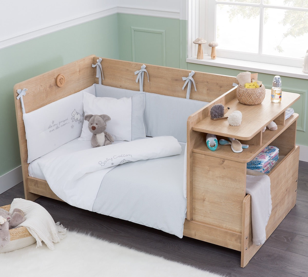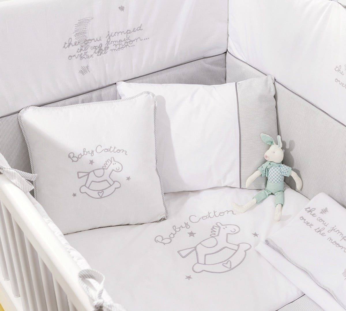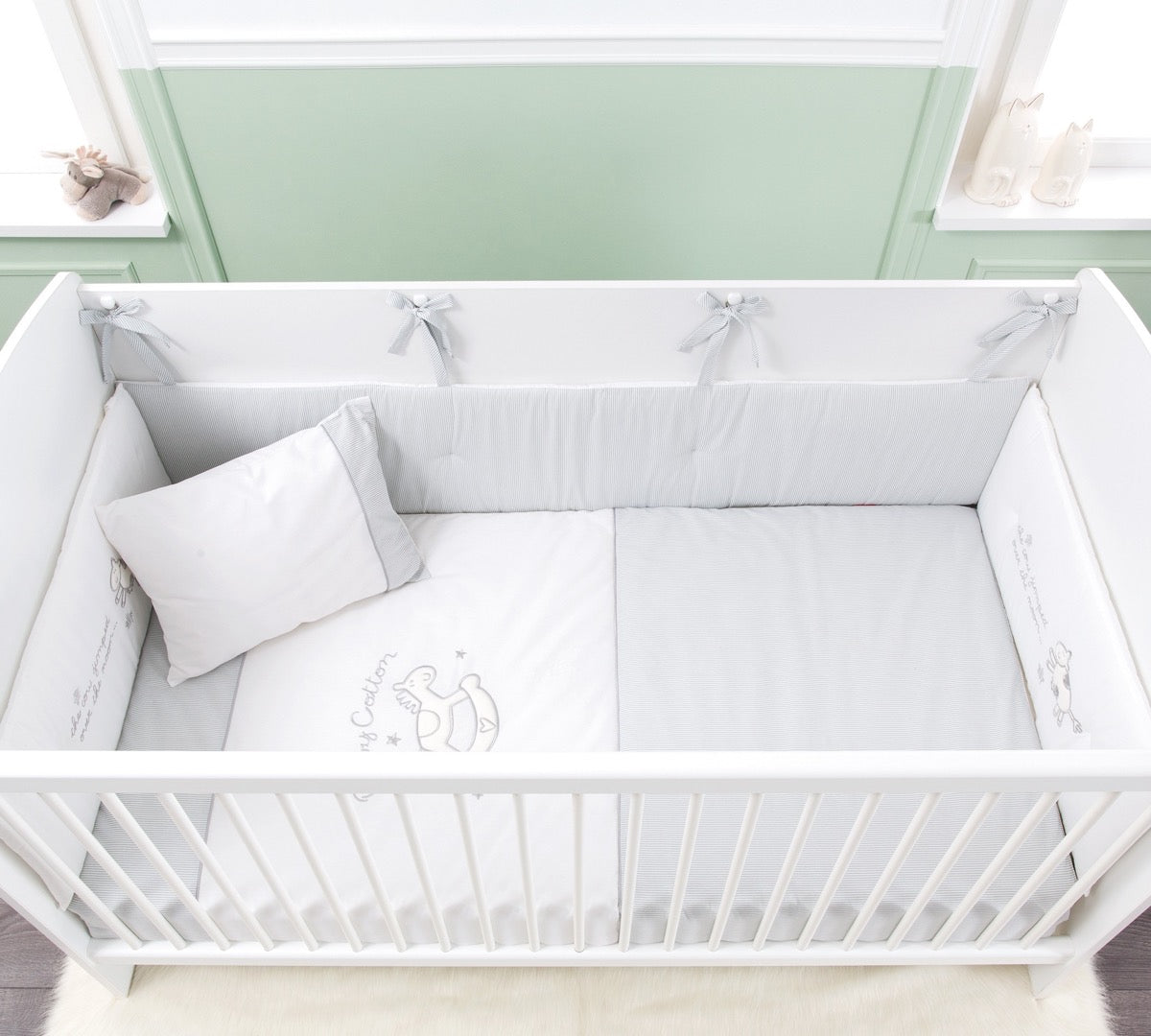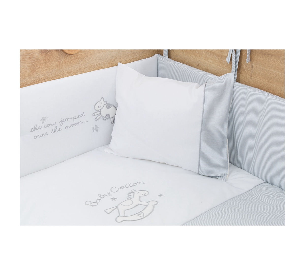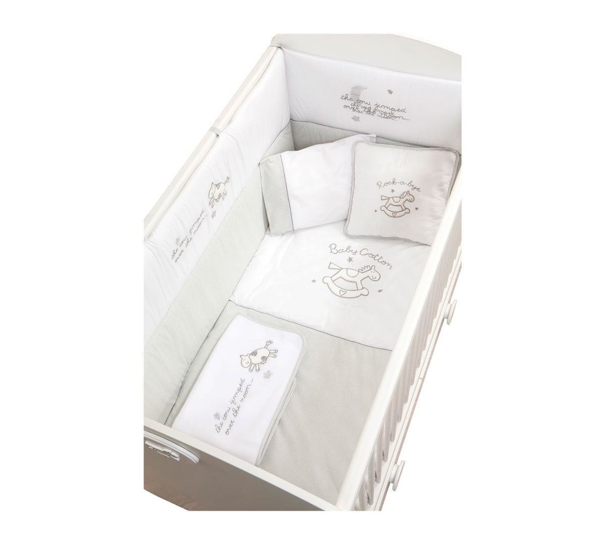 Detský postieľkový set BABY COTTON v jemných tónoch je navrhnutý pre dokonalé pohodlie Vašich detí. Materiál zo 100% bavlny je mäkký, jemný a hypoalergénny. Poskytuje dieťatku komfort počas spánku. Ochranné mantinely sa k postieľke priväzujú pomocou šnúrky. Držia pevne na svojom mieste, vďaka čomu dieťatku zabezpečujú ochranu proti úderu. Postieľkový set je možné prať na 30 stupňov a žehliť pri nízkej teplote. Materiál je 100% bavlna.