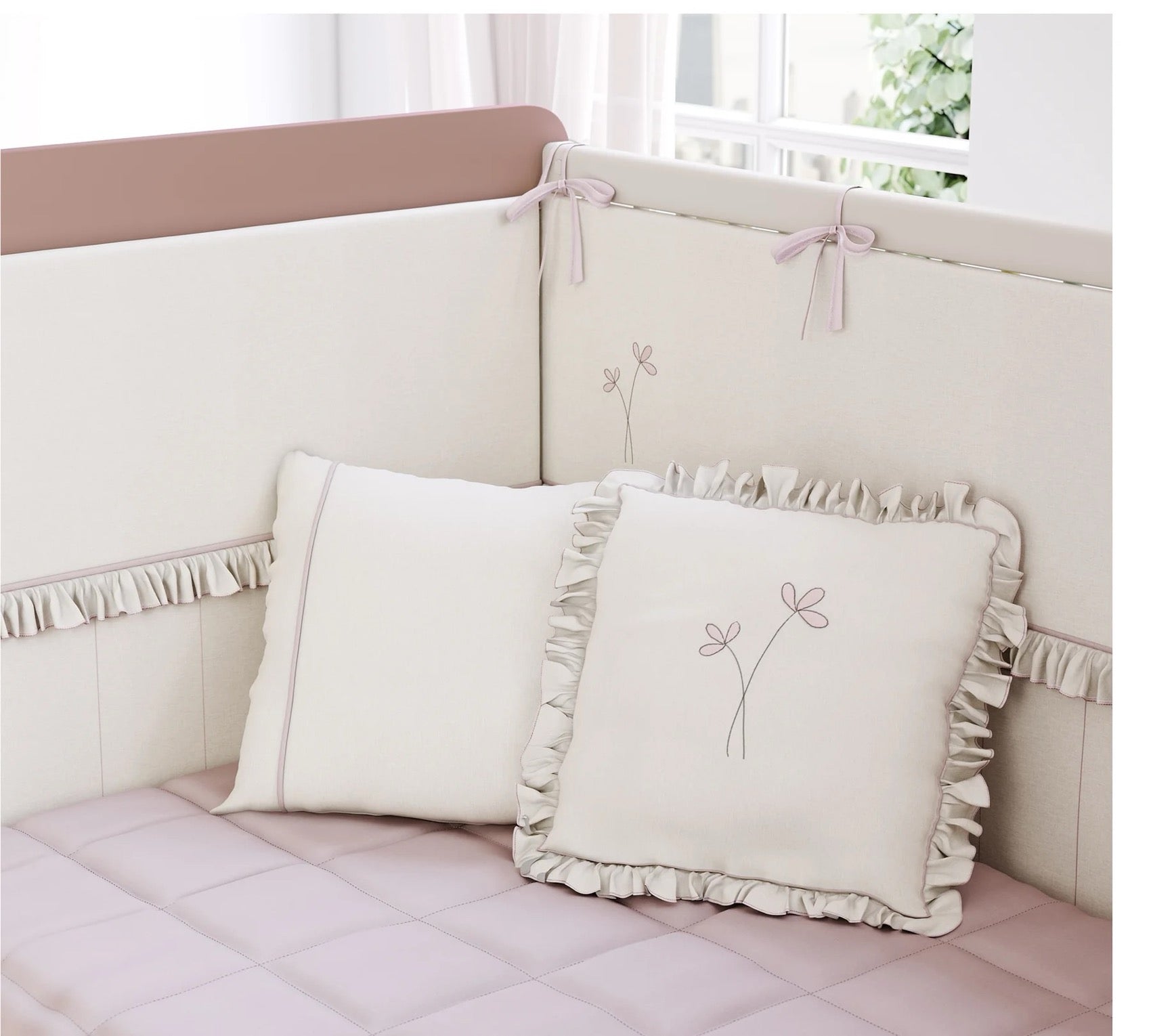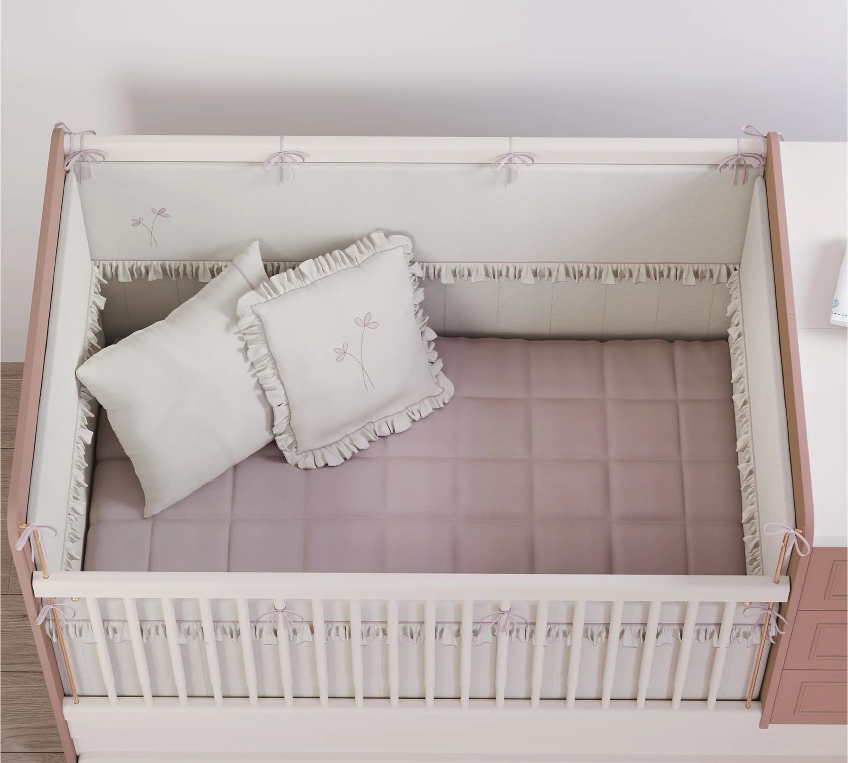 Detský postieľkový set ROSSY v jemných tónoch je navrhnutý pre dokonalé pohodlie Vašich detí. Materiál zo 100% bavlny je mäkký, jemný a hypoalergénny. Poskytuje dieťatku komfort počas spánku. Ochranné mantinely sa k postieľke priväzujú pomocou šnúrky. Držia pevne na svojom mieste, vďaka čomu dieťatku zabezpečujú ochranu proti úderu. Postieľkový set je možné prať na 30 stupňov a žehliť pri nízkej teplote.
