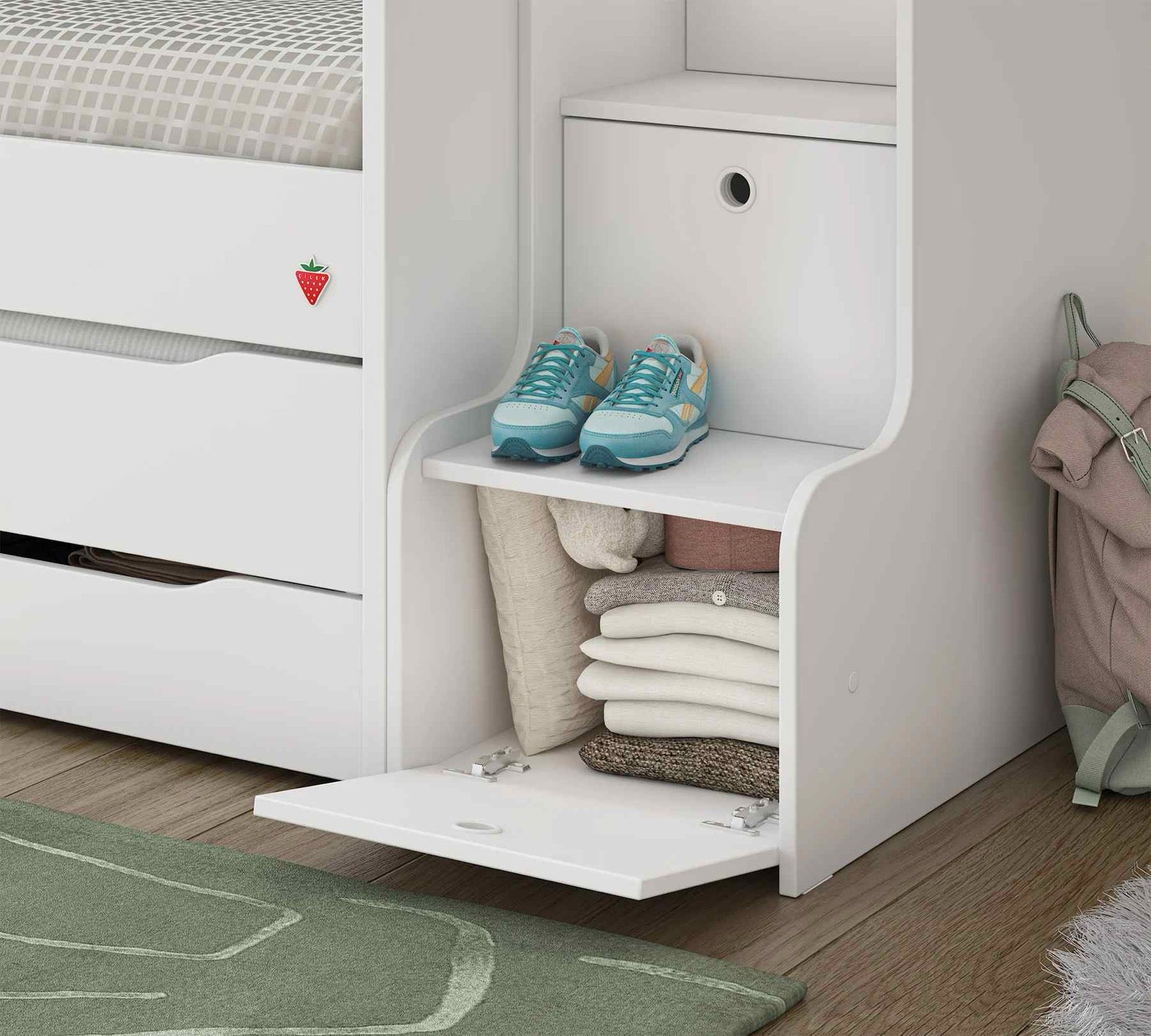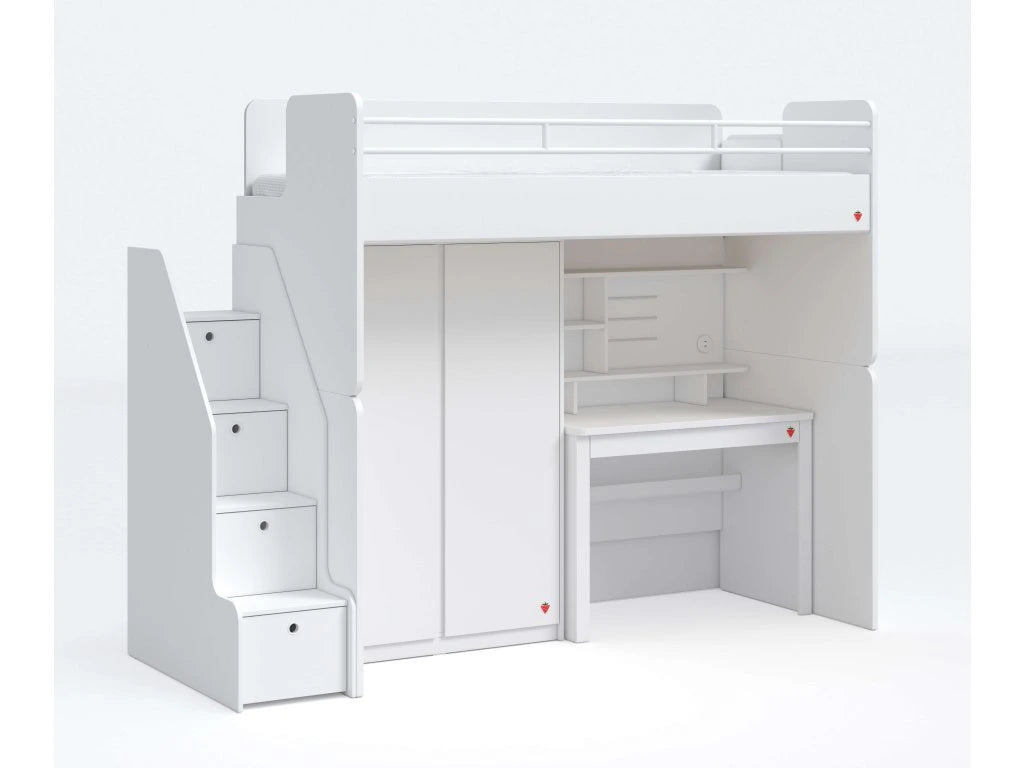 Študentská poschodová posteľ SUDIO VARIA WHITE je ideálnym riešením pre menšie detské izby, kde je potrebné maximalizovať priestor. Posteľ je navrhnutá s dôrazom na pohodlie a funkčnosť. Vďaka schodom so zásuvkami a skrini poskytuje množstvo úložného priestoru.