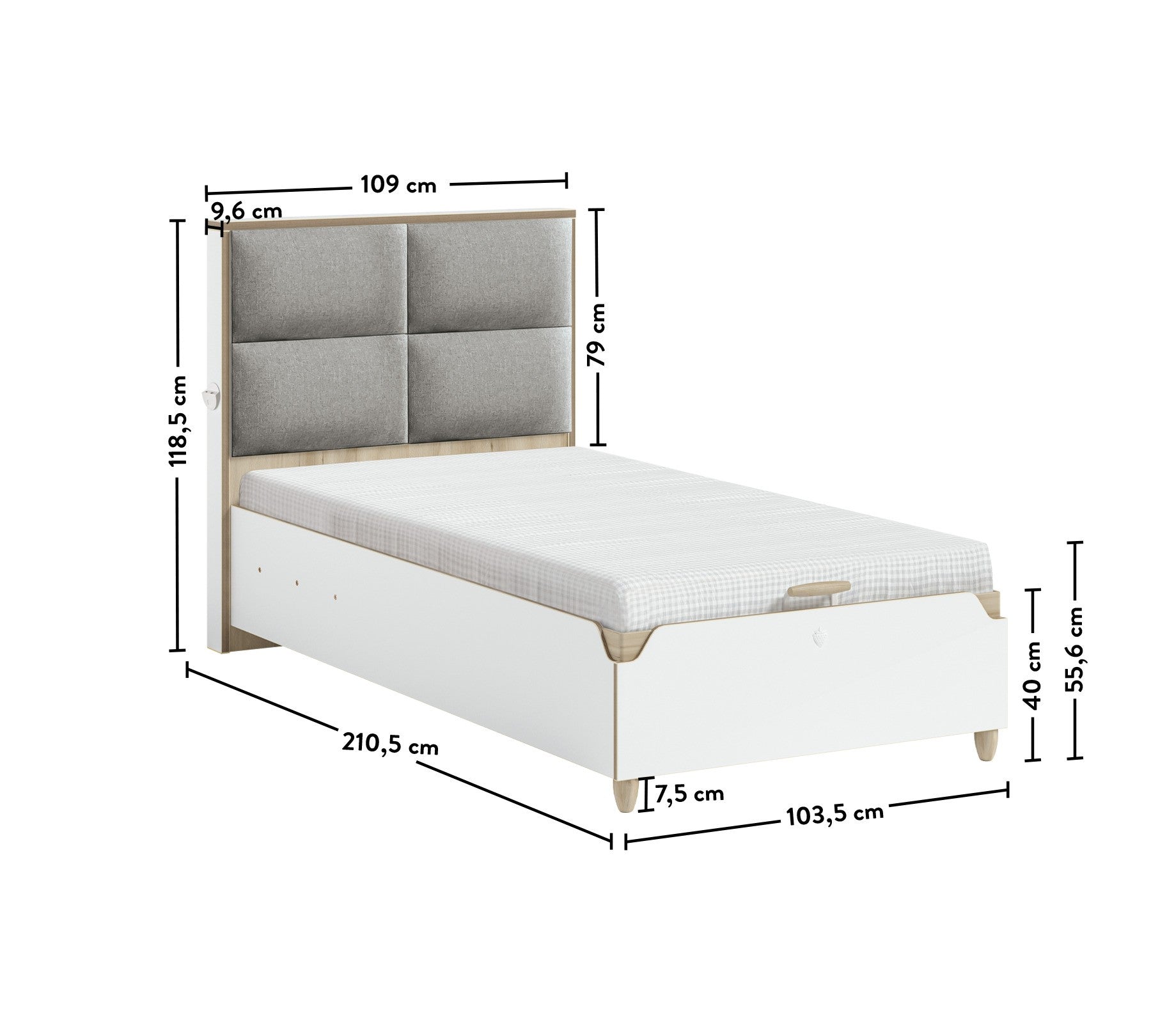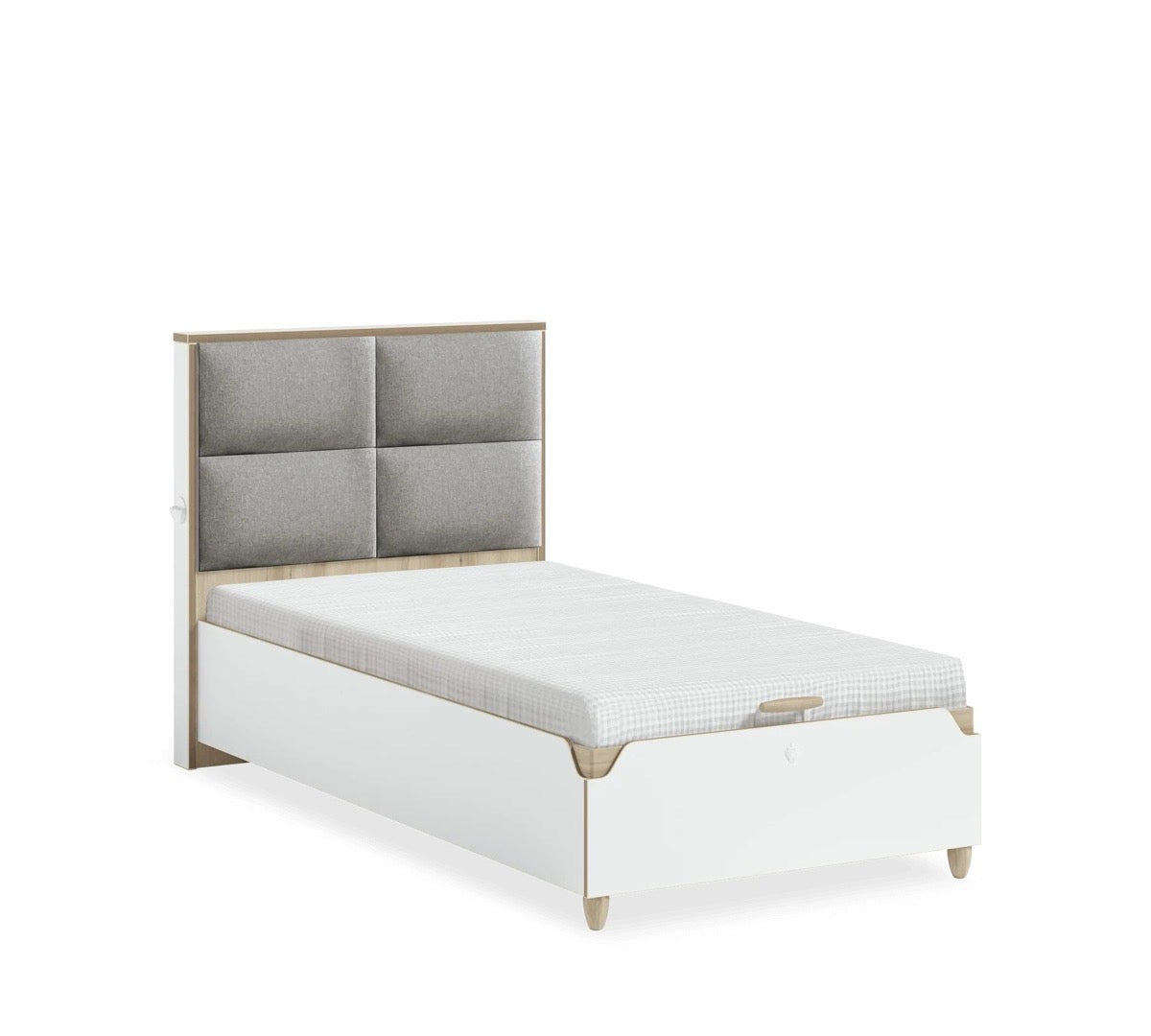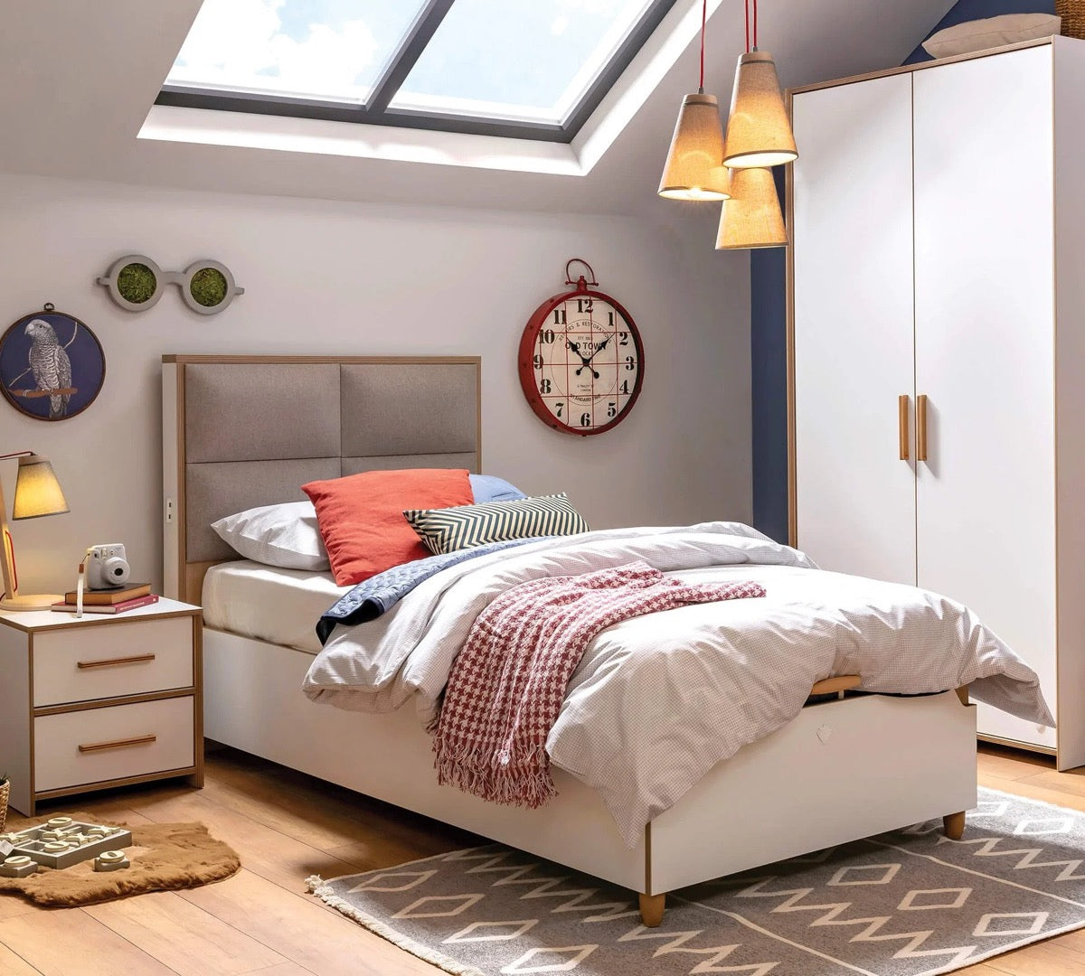Študentská posteľ MODERA s úložným priestorom svojím vzhľadom zapadne do každého interiéru. Svojou praktickosťou zaujme aj tých najnáročnejších. Čalúnené čelo postele obsahuje USB vstup pre nabíjanie Vašich smart zariadení. Vďaka jej zabudovanému úložnému priestoru Vám poskytuje veľký priestor na odkladanie vecí. Vyklápa sa do hora. V cene postele je zahrnutý kvalitný doskový rošt so spevneným kovovým rámom pre zabezpečenie optimálnej podpory a pohodlia pri spaní. Nosnosť postele je až 130 kg, čo zaručuje jej stabilnú a pevnú konštrukciu. Cena postele nezahŕňa matrac ani textilné doplnky. Môžete si tak vybrať a prispôsobiť posteľ podľa svojich preferencií a potrieb.