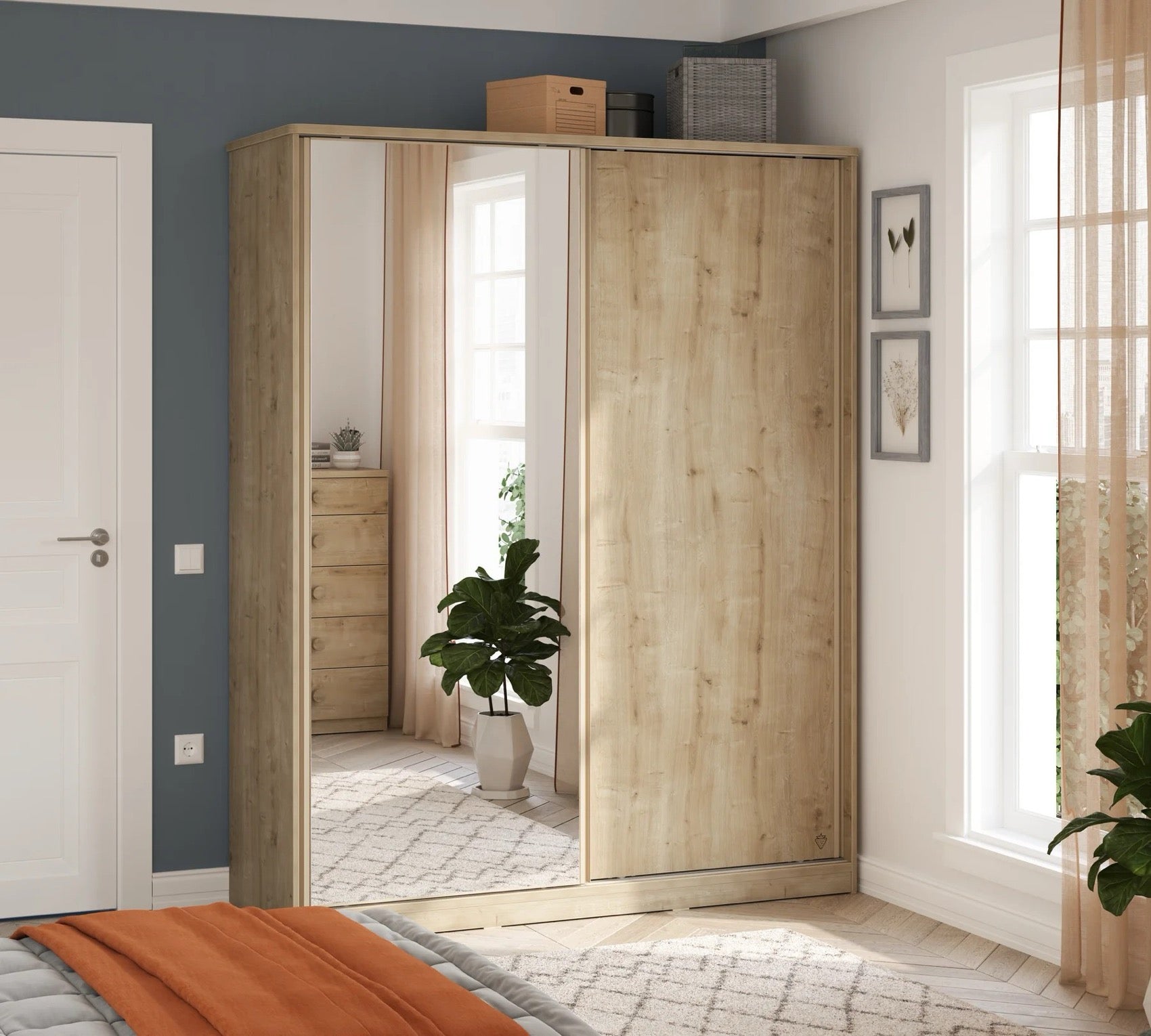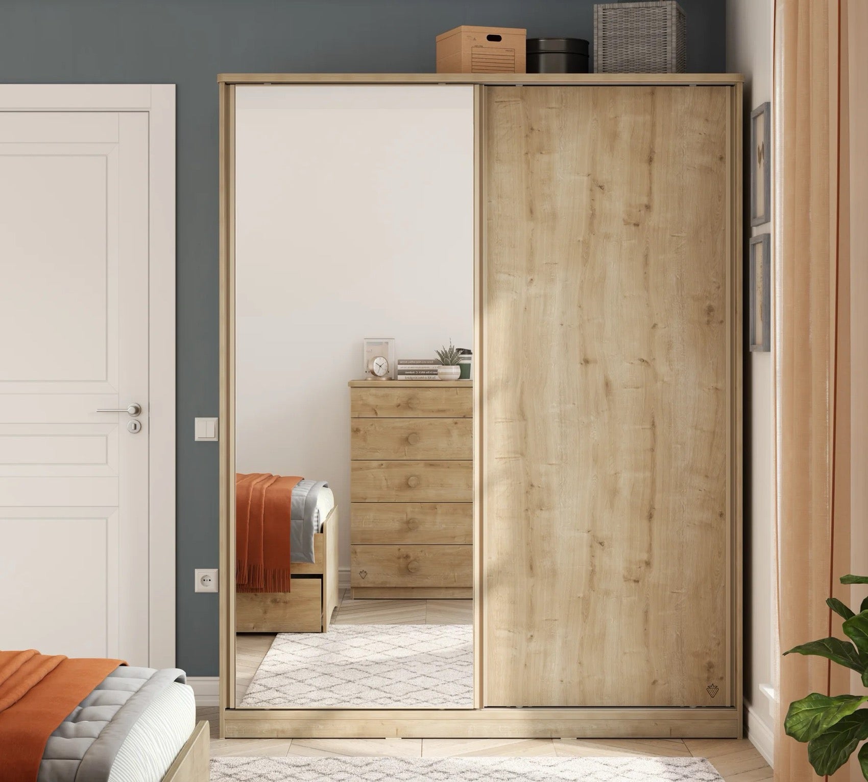 Študentská skriňa Mocha s posuvnými dverami je ideálnym riešením pre každú modernú izbu. Jej nadčasový dizajn v dubovom odtieni vytvára príjemnú atmosféru a skvele sa prispôsobí akémukoľvek interiéru. Dlhé zrkadlo na ľavej strane skrine opticky zväčšuje priestor a poskytuje praktické riešenie pre každodenné obliekanie. Vnútro skrine je navrhnuté s ohľadom na potreby študentov, pričom ponúka dva závesné priestory, množstvo políc a praktické zásuvky, ktoré vám pomôžu udržať poriadok vo vašich veciach. Zásuvky, rovnako ako posuvné dvere zaručujú bezpečné a tiché zatváranie. Balenie obsahuje mechanizmus na upevnenie o stenu, čo zvyšuje ochranu a zabraňuje prevrhnutiu skrine.